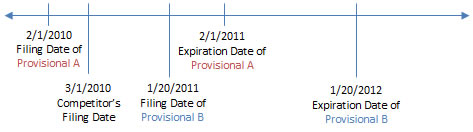 You can see above that once your Provisional A expired and disappeared, you are left with only Provisional B. Your Provisional B date is 1/20/2011. Your competitor's 3/1/2010 date is now in front of you in line. Your competitor previously was after you in line when you had Provisional A. However, once Provisional A expired, you lost your Provisional A date. Even though you re-filed a new Provisional B, the filing date of Provisional B is later than when the competitor filed. The competitor has now moved in front of you and the Patent Office will allow him first opportunity to get the patent before you.
