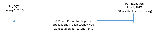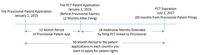 Inventor Joe files a Provisional Patent Application in the US on January 1, 2015. Provisional applications allow Joe 12 months of time to file full non-provisional patent applications in each country Joe wants to apply for patent rights in. For Joe, his provisional patent application will expire January 1, 2016. However, Joe is not ready to file a full patent application in every country by this time. Further, Joe wants to make sure he keeps the January 1, 2015 date of his provisional patent to keep his place in line as the first to invent. If he lets his provisional patent expire, he will lose his January 1, 2015 date, potentially allowing someone else to be first in line. To keep his date, Joe files a PCT Patent Application before January 1, 2016, which links to his PCT. He must file the PCT before the provisional patent application expires. The result is the PCT application will last 30 months from the provisional patent filing date and Joe has essentially extended his provisional patent application 18 additional months. This is 18 additional months Joe can file non-provisional full patent applications in each country he wants to apply in and they can all use the January 1, 2015 date of his provisional patent application. Joe’s PCT will expire on July 1, 2017, which is 30 months from the provisional patent application date.